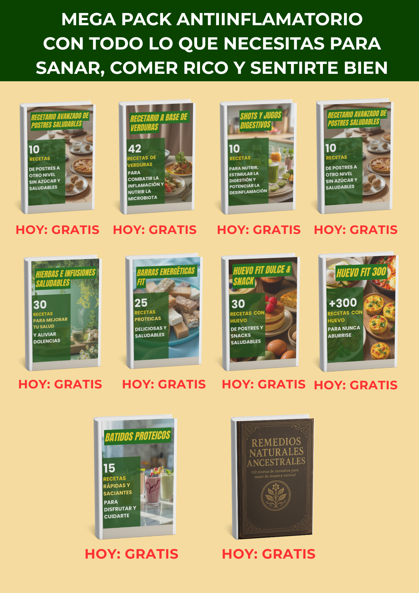 Incluye el Ebook principal "INTESTINO FELIZ" (100 recetas) más 9 Bonos Premium, sumando más de 550 recetas en total:
